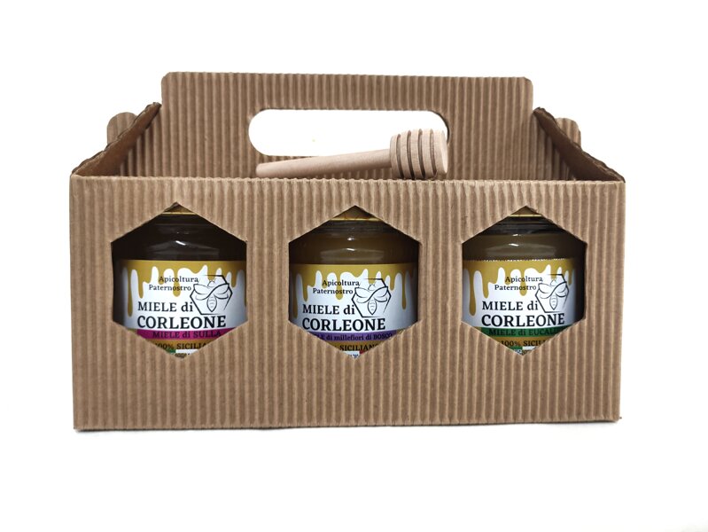Confezione regalo composta da 3 vasetti da 250g, possibilità di scegliere la tipologia del miele tra: millefiori , sulla, millefiori di bosco, arancio